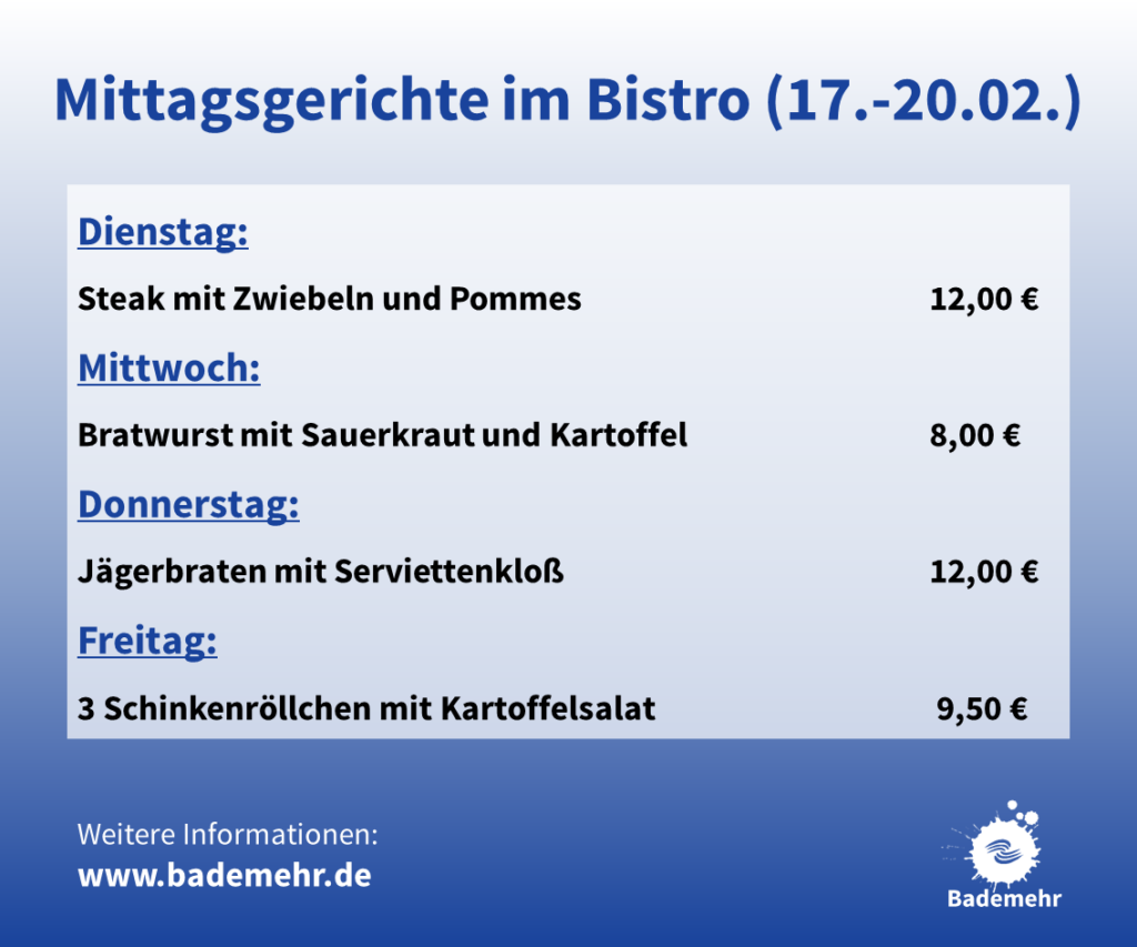 In unserem Bistro gibt’s die leckere Stärkung für den Freizeitspaß. Ein abwechslungsreiches Angebot und familienfreundliche Preise sorgen dafür, dass bei uns keiner hungrig bleibt! Dafür haben wir uns immer ein leckeres Mittagsgericht für Sie ausgedacht. Dieses Mittagsgericht ergänzt unsere Bistro-Speisekarte.